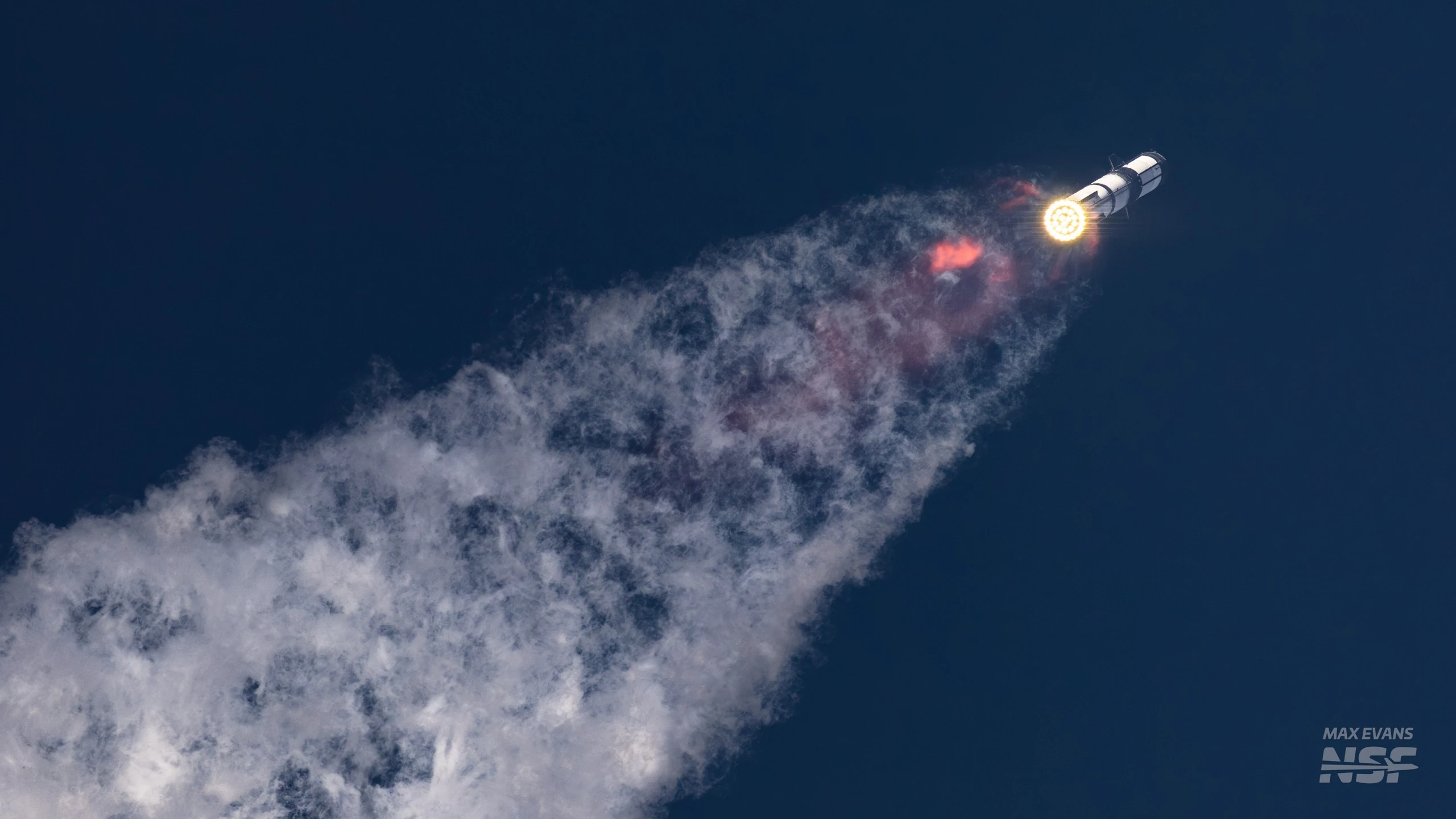 On May 27, 2025, Starship’s ninth flight test successfully lifted off at 6:36 p.m. CT from Starbase, Texas. The flight test began with the first Super Heavy booster to be reflown starting up successfully and completing a full-duration ascent burn with all 33 of its Raptor engines before separating from Starship’s upper stage in a hot-staging maneuver. During separation, Super Heavy performed the first ever deterministic flip followed by its boostback burn.